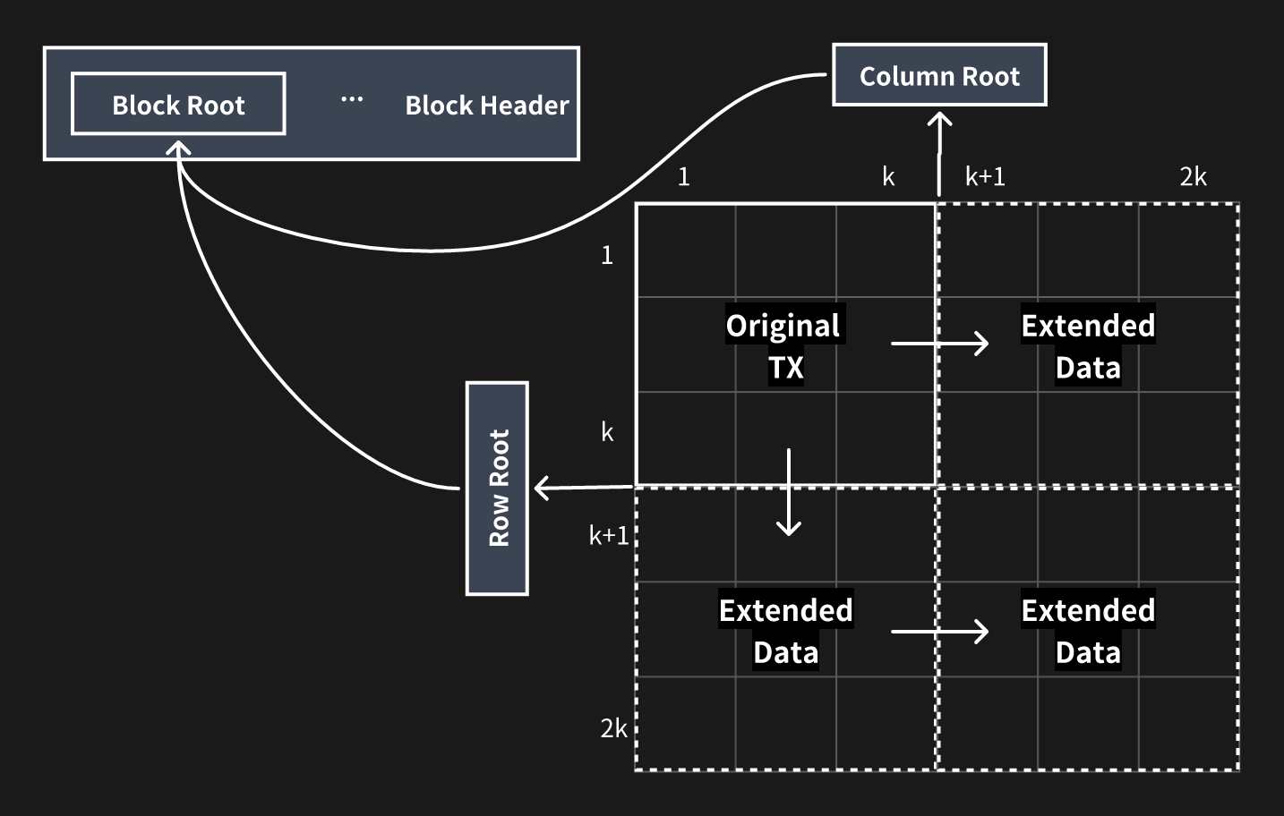 These Merkle roots are finally formed into one Merkle tree and the root of the tree is used as the root of the whole block, and we combine the root and other metadata into the header. Then the header and original body are broadcast through the P2P network. When other DA nodes receive the block, they will repeat the 2-dimension RS encoding the same way above and calculate the root, then accept it if it is the same as the one in the header.