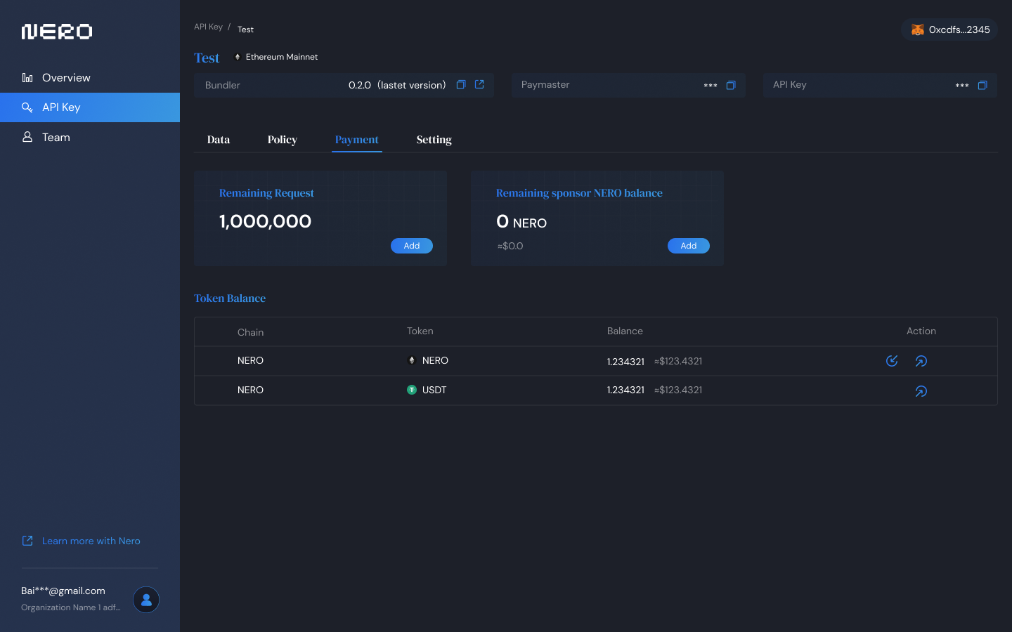NOTE: Adding NERO here means the funds your API will use to pay for the Gas of your application requests.