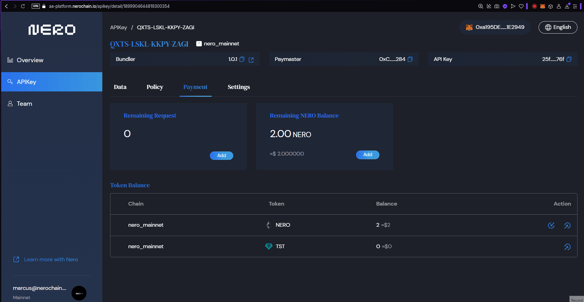To add NERO tokens to your APIKey, follow the steps: