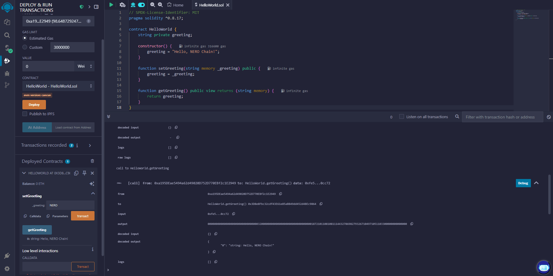 Congratulations! You’ve successfully deployed a smart contract on NERO Chain using Remix. This basic workflow—writing, compiling, deploying, and interacting with contracts—remains the same for more complex projects.