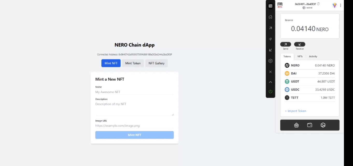 このチュートリアルでは、NERO WalletテンプレートにNFTミント、トークン作成、NFTギャラリー機能を追加する方法を解説します。最後まで完了すると、以下のような結果になるはずです。